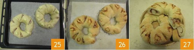 Dejad fermentar durante aproximadamente una hora 25, luego hornead en horno estático precalentado a 180°C durante unos 30 minutos, en la bandeja del medio del horno. Transcurrido el tiempo de cocción, sacad del horno 26 y dejad enfriar sobre una rejilla. Servid el pan de San Petronio aún tibio 27.