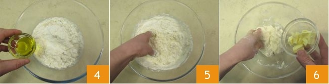 Añadid también el aceite 4 y comenzad a mezclar. Cuando hayáis reunido los ingredientes en una masa única, añadid también la mantequilla blanda en trozos 6.