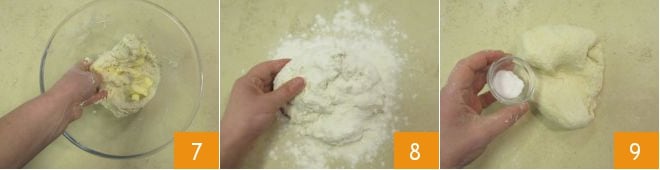 Continuad amasando para incorporar la mantequilla 7. Luego, trasladad la masa a la superficie de trabajo ligeramente enharinada y enharinad también la masa (bastarán aproximadamente 30 g de harina) 8: no deberá resultar pegajosa, sino suave y elástica. Amasad por unos momentos, luego agregad la sal 9 y amasad nuevamente para que se absorba.