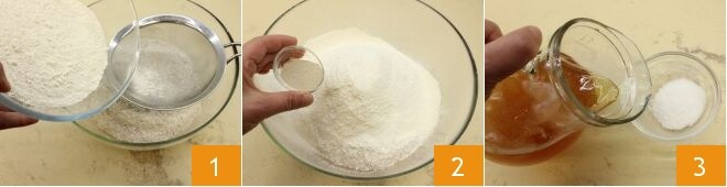 Para realizar el pan de sidra tamizad en un bol grande la harina de fuerza y la harina integral 1, añadid la levadura seca de panadería 2 y la malta. En un pequeño bol disolved la sal en una cucharada de sidra tomada de la dosis total 3,