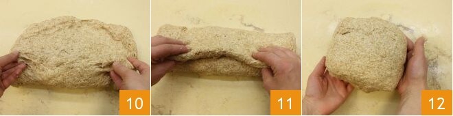 trasladad aquí la masa, de este modo no se pegará y no tendréis que añadir más harina. Dad a la masa una forma rectangular 10, superponed los lados largos 11, luego doblar también los lados cortos 12.