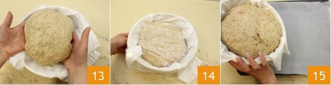 Recoged la masa dándole una forma esférica y colocadla en el bennettons 13, cubrid con film transparente 14 y dejad fermentar de nuevo en el horno apagado con la luz encendida durante 1 hora, la masa deberá llegar al borde del cesto. Volcad el pan bien fermentado sobre una bandeja de horno forrada con papel de horno 15