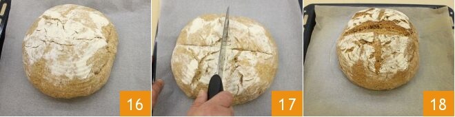 cread un corte en cruz en la superficie con un cuchillo bien afilado (16-17). Hornead el pan teniendo cuidado de colocar en el fondo del horno un bol con agua, de este modo se creará un ambiente húmedo que ayudará a la cocción del pan. Usad un bol de terracota o asegúraos de que sea apto para la cocción en horno. Coced el pan en horno estático precalentado a 250° durante 40 minutos. Pasado este tiempo, quitad el bol lleno de agua y bajad la temperatura a 200°, proseguid durante otros 20 minutos, luego dad la vuelta a la hogaza y continuad la cocción durante otros 20 minutos. Apagad el horno y dejad enfriar el pan con el horno entreabierto y luego sacadlo 18.