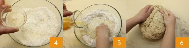 unid la mezcla a la masa 4, añadid a hilo, poco a poco también la sidra y recoged los ingredientes con las manos 5. Trasladad la masa a la superficie de trabajo y continuad amasando hasta que esté lisa y suave 6.