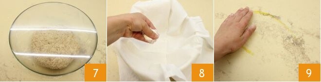Trasladad la masa a un bol, cubrid con film transparente 7 y dejad que fermente en el horno apagado con la luz encendida durante 2 horas. Tomad el cesto para la fermentación del pan, el bannetons. Cubridlo con una muselina y enharinad generosamente 8. Si no disponéis de muselina, podéis usar un paño limpio. Engrasad con aceite una superficie de trabajo 9