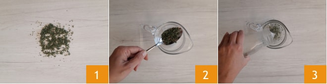 Para preparar el pan de tomillo con masa madre, comienza preparando la infusión de tomillo, puedes hacerlo incluso el día anterior. Limpia el tomillo pasando los dedos por las ramas para obtener solo las hojas 1. Lleva a ebullición 350 g de agua; toma una jarra y pon dos cucharadas de tomillo fresco 2, luego añade el agua hirviendo 3.