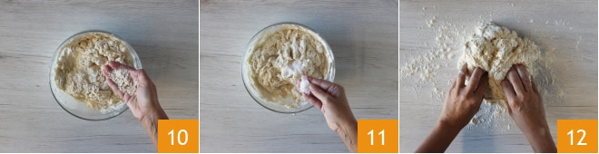 Añade el malta en polvo 10 y la sal fina 11. Vuelca la masa en una superficie enharinada y amasa con las manos 12