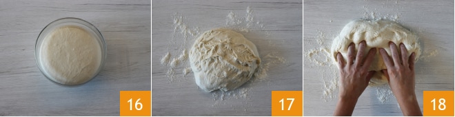 y déjala reposar hasta que duplique su tamaño 16. Tomará unas 5 horas. Pasado el tiempo de reposo, vuelca la masa en la superficie enharinada 17 y desgasifícala suavemente con las manos, tratando de darle una forma rectangular 18.