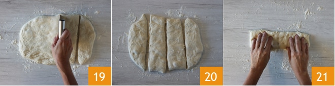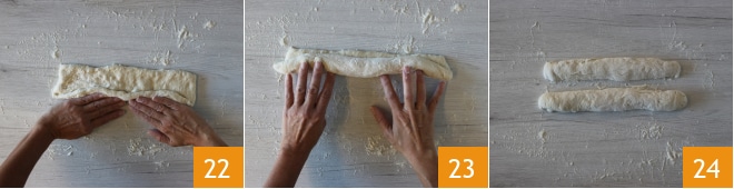 y forma los panes: comienza cerrando el rectángulo de masa desde el lado largo hacia el exterior 22 y enróllalo hasta cerrarlo completamente 23 24.