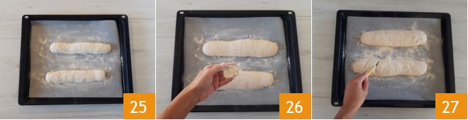 Coloca los panes en una bandeja de horno cubierta con papel de hornear, con el cierre hacia abajo 25. Deja que los panes fermenten hasta doblar su tamaño. Tomará unas 2 horas. Espolvorea los panes con sémola de trigo duro 26 y realiza cortes en la superficie 27,