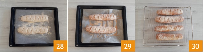 separándolos entre sí unos pocos cm 28. Hornea en horno ventilado precalentado a 250°, colocando un recipiente de agua en el fondo del horno, durante 10 minutos. Baja la temperatura del horno a 200°, retira el recipiente de agua y continúa horneando durante 25 minutos. Los últimos 5 minutos hornea con la puerta del horno ligeramente abierta con una cuchara de madera, para que salga la humedad. Retira del horno 29 y deja enfriar sobre una rejilla 30, antes de servirlo.