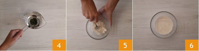 Deja enfriar completamente la infusión de tomillo, luego cuélala con un colador 4. Desmenuza la masa madre refrescada en un bol, añade 50 g de agua y mezcla 5 hasta disolverla completamente 6.