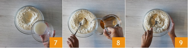 Vierte la harina en un bol y añade la masa madre disuelta 7. Incorpora la infusión de tomillo 8, poco a poco y mezcla con una cuchara 9.
