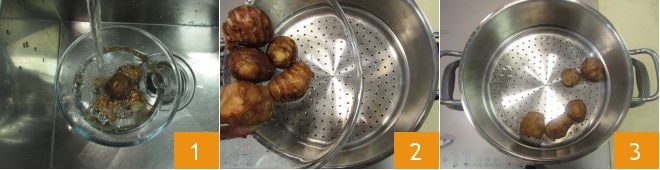 Para realizar el pan de tupinambo, primero lava el tupinambo bajo el agua corriente 1, luego colócalo en una vaporera 2 y cocínalo durante unos 15-20 minutos 3, o hasta que esté suave. La cocción al vapor permite obtener una pulpa tierna pero no acuosa.