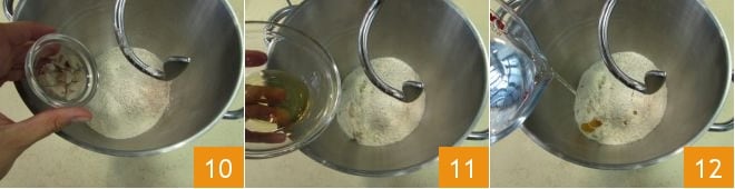 agrega la levadura desmenuzada 10, la miel 11 y el resto del agua 12.