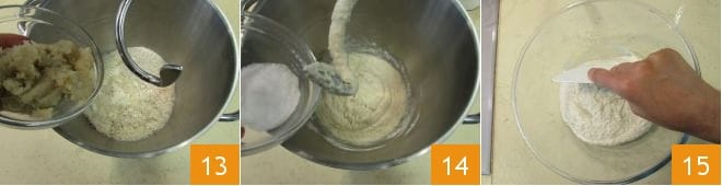 Por último, vierte también el puré de tupinambo 13 y pon en marcha la máquina para mezclar los ingredientes. En este punto, agrega también la sal 14 y sigue amasando durante 5 minutos. Transfiere la masa a un bol y con la ayuda de una espátula, haz 4 pliegues 15.