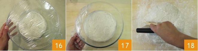 Cubre con film 16 y repite la misma operación después de 10 minutos. Procede de esta manera un total de 3 veces. Después, cubre con film y deja que fermente a unos 26-28° durante 2 horas; estará bien en el horno apagado con la luz encendida. Transcurrido este tiempo, retoma la masa fermentada 17, transfiérela a una superficie enharinada y divídela en dos partes iguales con una espátula 18.