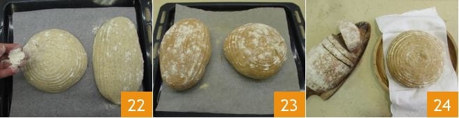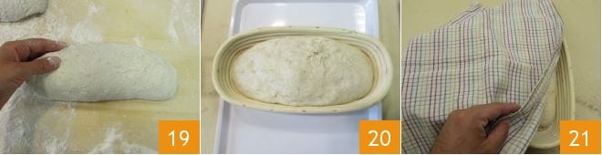 Enharina dos moldes de madera y da a las dos masas la forma del molde correspondiente 19. Coloca dentro los bollos 20, cubre con un paño 21 y deja que fermenten durante 90 minutos protegidos del aire en un ambiente templado.