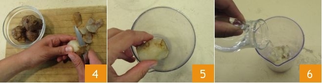 Al término de la cocción, pela los tupinambos 4 y colócalos en el vaso alto de una batidora 5: necesitarás unos 90-95 g de pulpa de tupinambo. Vierte 100 g de agua 6