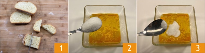 Para preparar el pan frito dulce, primero corta el pan duro en rebanadas o trozos, según el tamaño 1. En un bol, vierte los huevos con el azúcar 2 y la sal 3.