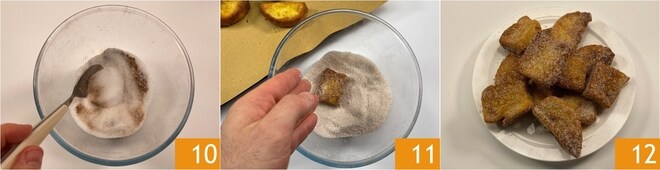En otro bol, mezcla el azúcar con la canela 10. Cubre los cubitos con el azúcar aromatizado 11 y sirve enseguida tu pan frito dulce 12!