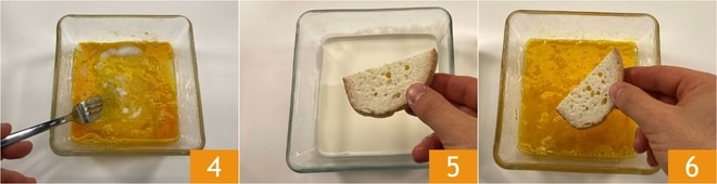 Bate bien con un tenedor 4. Sumerge rápidamente cada trozo de pan primero en la leche 5 y luego en la mezcla de huevos 6, dejando escurrir el líquido en exceso.