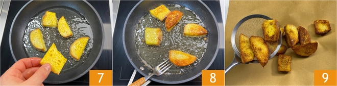 En este punto, calienta en una sartén una cantidad de aceite vegetal que cubra el fondo, no debe estar hirviendo. Coloca los trozos de pan en el aceite caliente 7 y deja que se doren por unos minutos por cada lado 8. Escurre el pan sobre papel absorbente o para frituras 9.