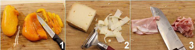 Para realizar el pan relleno, comienza asando en el horno el pimiento amarillo, cuando esté cocido pélalo y córtalo en tiras 1 (alternativamente puedes utilizar pimientos ya asados). Corta la fontina en lonchas finas 2 y el jamón cocido de Praga en tiras 3.