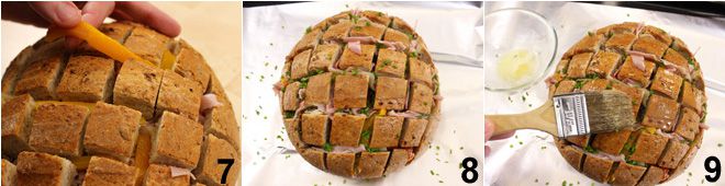 Con un cuchillo de sierra, corta la hogaza en rebanadas de unos 3,5 cm de ancho sin llegar a la base del pan, procede cortando las rebanadas también perpendicularmente (siempre sin tocar el fondo), así obtendrás una superficie en forma de tablero de ajedrez 4. Comienza a rellenar el pan: introduce en los cortes realizados la fontina 5, el jamón de Praga 6,