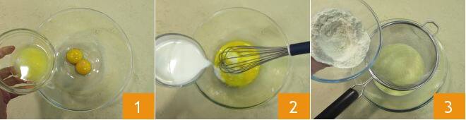 Para preparar los pancakes de cacao, comenzad fundiendo la mantequilla a fuego muy lento, luego dejad que se temple. Separad las claras de las yemas; en el bol con las yemas verted la mantequilla fundida templada 1 y mezclad. Una vez integrado, añadid la leche a temperatura ambiente 2 y la harina tamizada junto con la levadura 3.