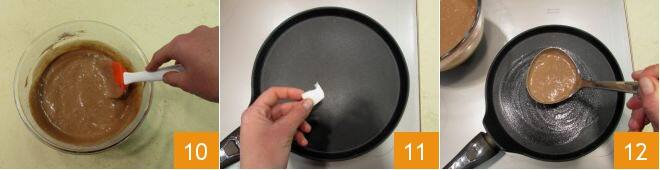 Luego añadid las claras restantes e integradlas con movimientos de abajo hacia arriba con una espátula 10. Poned a calentar una sartén grande antiadherente (mejor si tiene fondo grueso) a fuego medio (no alto, de lo contrario no daréis tiempo a la masa a que suba bien durante la cocción) y engrasad con un poco de mantequilla extendida sobre la superficie 11. Verted un cucharón de masa en el centro de la sartén 12, no será necesario extenderlo.