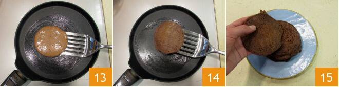Cuando comiencen a aparecer burbujas en la superficie 13, dadle la vuelta al otro lado 14 y dejad que se dore también por ese lado. Continuad así con el resto de la masa y, a medida que estén listos, colocad los pancakes en un plato grande, apilándolos uno sobre otro 15. Servid los pancakes de cacao con sirope de arce o, si preferís, espolvoreadlos con azúcar glas y acompañadlos con fruta fresca o frutos rojos.