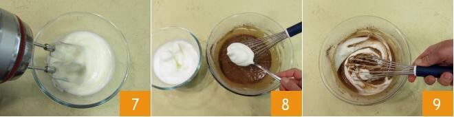 Continuad trabajando hasta obtener una mezcla blanca y espumosa 7. Verted una cucharada de claras montadas en el bol con la mezcla de cacao 8 y mezclad suavemente con la varilla de mano 9.