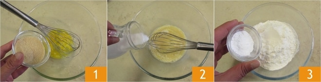 Para preparar los pancakes de coco, primero coloca los huevos en un bol junto con el azúcar moreno 1 y bate con una varilla. Añade la leche de coco 2 y mezcla nuevamente. En otro bol, mezcla la harina y la levadura 3.