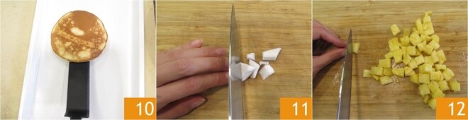 Transfiere el pancake a una bandeja 10 y procede de esta manera hasta agotar la mezcla, apilándolos uno encima del otro; con estas cantidades deberías obtener unos 12 pancakes. Una vez listos, corta el coco en trozos 11 y la piña en cubitos 12.