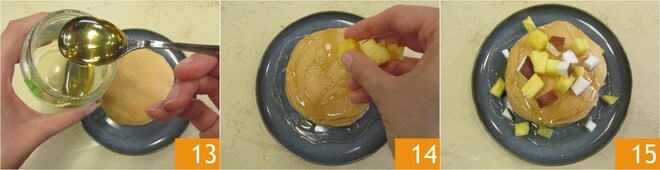 Rocía los pancakes con miel de acacia 13 y adorna con los trocitos de fruta 14. Tus pancakes de coco están listos para disfrutar 15!