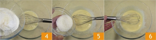 Incorpora los ingredientes secos 4 y mezcla para integrarlos, luego añade también el coco rallado 5. Remueve para obtener una mezcla suave y homogénea 6.
