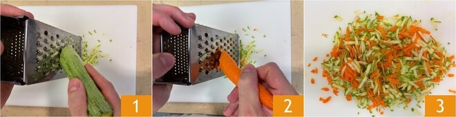 Para preparar las tortitas de verduras, comenzad lavando bien los calabacines y eliminando los extremos, luego ralladlos con un rallador de agujeros grandes 1. Estrújalos bien con las manos para eliminar el exceso de agua: este paso es fundamental para evitar que la masa resulte demasiado líquida. Proceded de la misma manera con las zanahorias: peladlas con un pelador, quitad los extremos y ralladlas 2. Reunid calabacines y zanahorias 3 en un bol.
