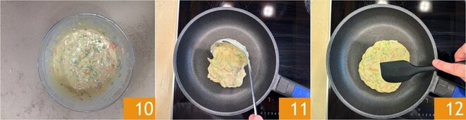 Mezclad para amalgamar y obtener así una masa densa y homogénea 10. Calentad una sartén antiadherente, de unos 15 cm de diámetro, a fuego medio. Cuando esté bien caliente, verted un cucharón de masa en el centro 11 y, con una espátula, aplastad ligeramente la superficie para darle una forma redonda y compacta 12.