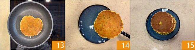 Cocinad la tortita hasta que se formen burbujas y los bordes se desprendan fácilmente, luego dadle la vuelta con una espátula 13 y continuad la cocción hasta que esté bien dorada por ambos lados. Cuando esté lista, trasladadla a un plato 14. Continuad de la misma manera hasta terminar toda la masa, apilando las tortitas a medida que estén listas: con estas cantidades obtendréis alrededor de 5 tortitas. ¡Vuestras tortitas de verduras están listas para ser servidas calientes o templadas 15!