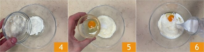 En otro bol grande, verted la harina 00 y el Parmigiano Reggiano rallado 4, luego añadid un huevo entero 5, la leche en hilo 6 y la sal.