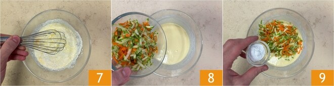 Mezclad con un batidor de mano hasta obtener una mezcla lisa y sin grumos 7. En este punto, unid las verduras ralladas y bien escurridas 8 y la levadura instantánea para preparaciones saladas 9.
