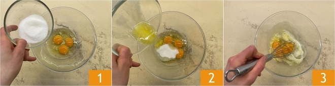 Para preparar los panqueques finlandeses, en un bol, verted los huevos, el azúcar 1 y la mantequilla derretida tibia 2. Mezclad enérgicamente con un batidor de mano 3.