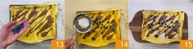 Completa con arándanos frescos 13 y azúcar glas 14. Tu panqueque finlandés está listo 15, ¡córtalo en porciones y sírvelo enseguida!