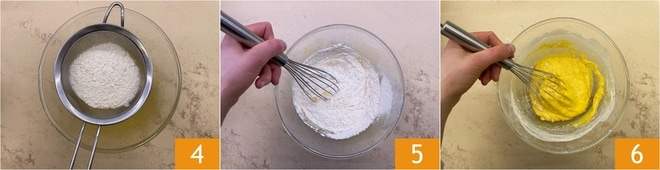 Tamiza la harina en el bol 4 y mezcla bien con un batidor 5 para evitar grumos 6.