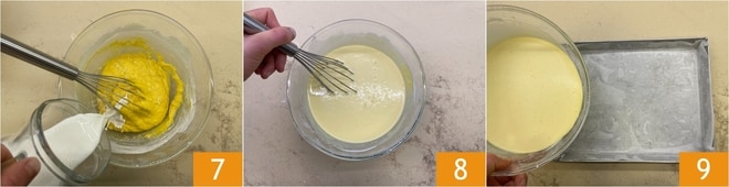 Vierte la leche en hilo 7 mientras sigues mezclando con el batidor hasta obtener una masa lisa, homogénea y sin grumos 8. Unta con mantequilla y forra una bandeja rectangular de 20x30 cm con papel de horno. Vierte la masa.