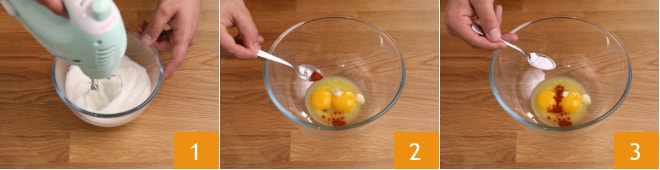 Para preparar los pancakes salados con salsa de Grana Padano DOP empieza con la masa de los pancakes: derrite la mantequilla a fuego muy bajo y reserva. Separa los huevos, separando yemas y claras en dos recipientes diferentes. Monta las claras 1 y resérvalas. En el bol con las yemas vierte la mantequilla derretida ya tibia, la sal, el pimentón dulce 2, el bicarbonato 3