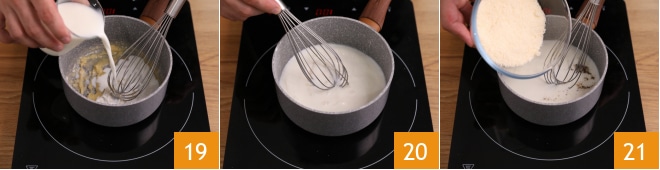 En este punto, vierte la leche entera 19, mezcla y lleva a ebullición 20. Añade una pizca de pimienta, el Grana Padano DOP 21