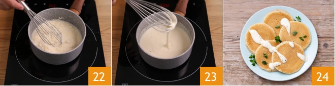 y mezcla 22 hasta que la salsa se haya espesado 23. La salsa está lista, sírvela junto con tus pancakes salados con salsa de Grana Padano DOP 24.