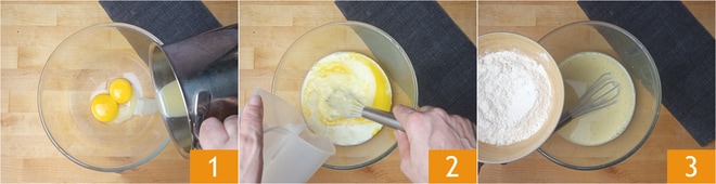 Para preparar los pancakes salados, lo primero es derretir la mantequilla en un cazo a fuego lento o en el microondas. Mientras tanto, separa las yemas de las claras. En el bol con las yemas, vierte la mantequilla templada 1, añade la leche lentamente y mezcla 2. En este punto, añade la sal, la pimienta y la harina 3.